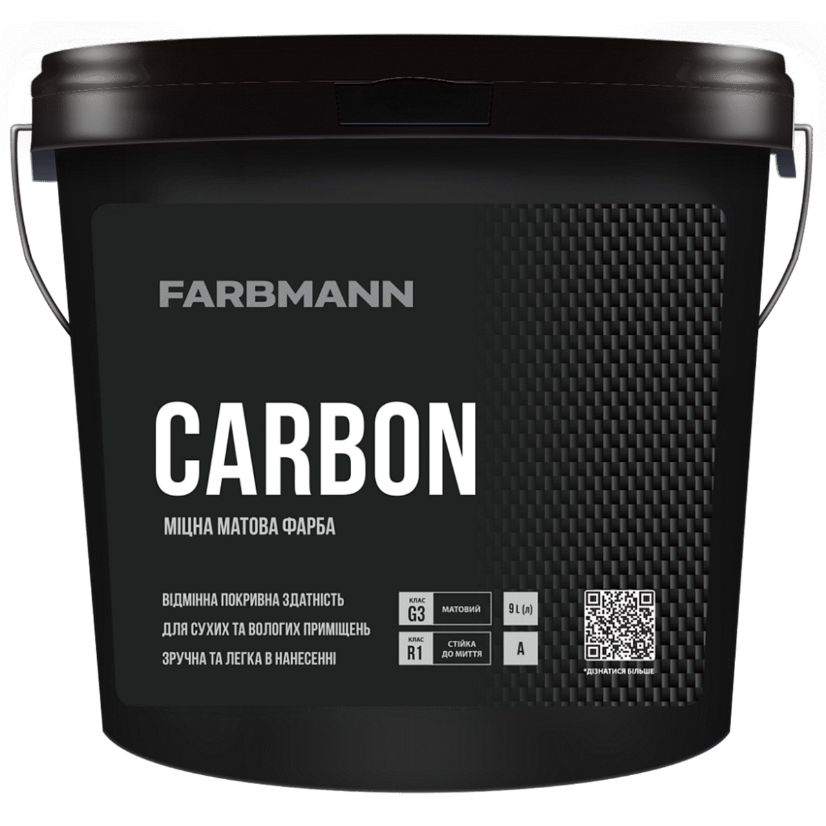 Farbmann Carbon – інтер’єрна акрилова фарба, що створює рівне матове покриття та забезпечує комфортне нанесення завдяки збалансованій акриловій формулі. Склад рівномірно розподіляється по основі, має добру покривність і формує зносостійку плівку. Матеріал безпечний, не має різкого запаху та підходить для фарбування житлових, громадських і робочих приміщень.