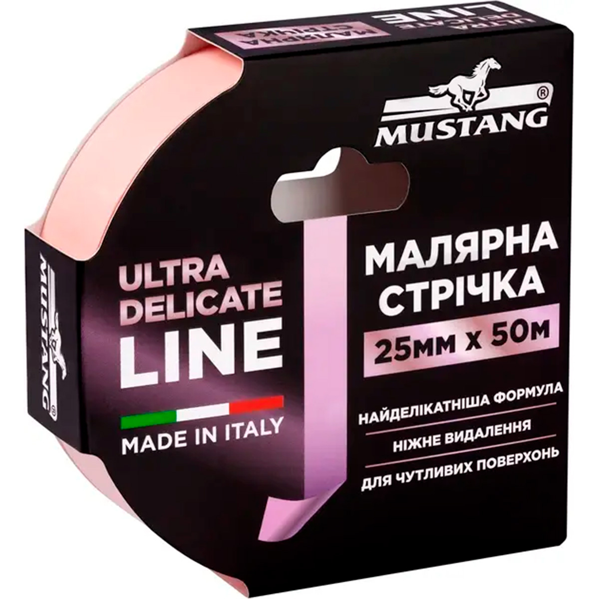 Малярна стрічка Mustang Ultra Delicate Line 25 мм × 50 м, рожева виготовлена з тонкого рисового паперу з ультраделікатним акриловим клеєм. Призначена для точного фарбування чутливих поверхонь, забезпечує рівні краї та легко знімається без пошкоджень і слідів клею. Ідеально підходить для внутрішніх оздоблювальних робіт при кімнатній температурі.