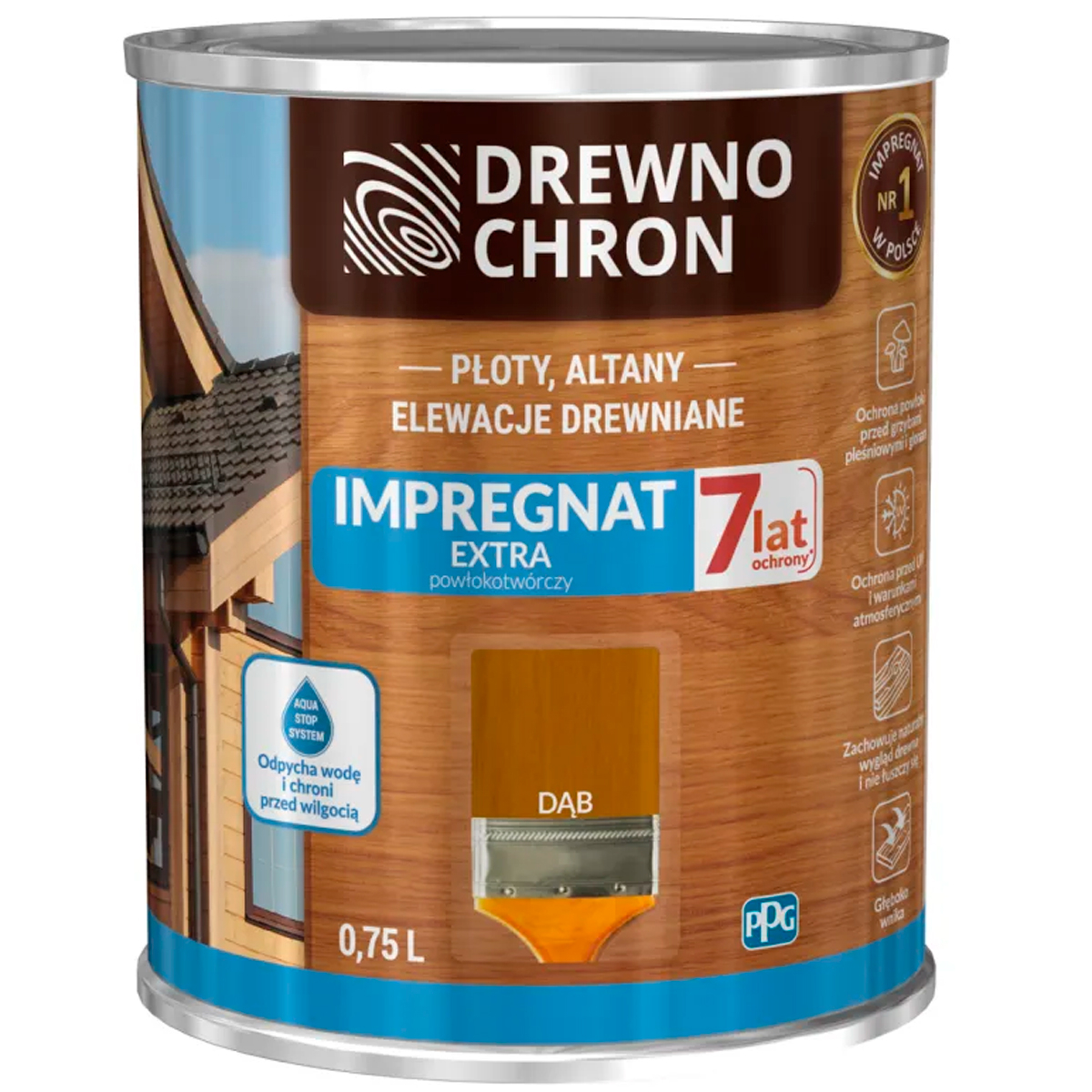 Пропитка для дерева Drewnochron Impregnat Extra — захисно-декоративний засіб для зовнішнього оброблення деревини, що забезпечує довготривалий захист до 7 років. Завдяки технології Aqua Stop System створюється водовідштовхувальне покриття, стійке до дощу, снігу, вологи та ультрафіолету. Склад проникає в структуру деревини, захищає її від гниття, плісняви та водоростей, зберігаючи природну текстуру та зовнішній вигляд матеріалу. Підходить для садових меблів, фасадів, терас, альтанок, дверей, вікон і парканів. Може застосовуватися зовні та всередині нежитлових приміщень.